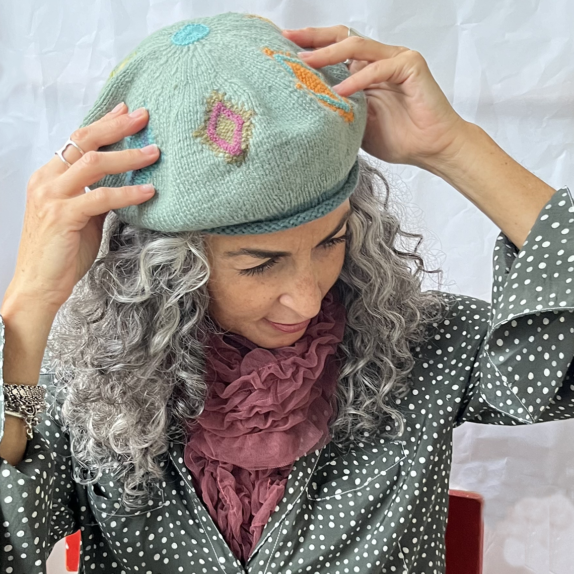 $56.00A melange of beautiful diamonds intarsia knit and trimmed in embroidery. A cheery hat for gray highland winter days. Softness in color and fit. Alpaca blend. Hand knit in Peru. Hand wash.