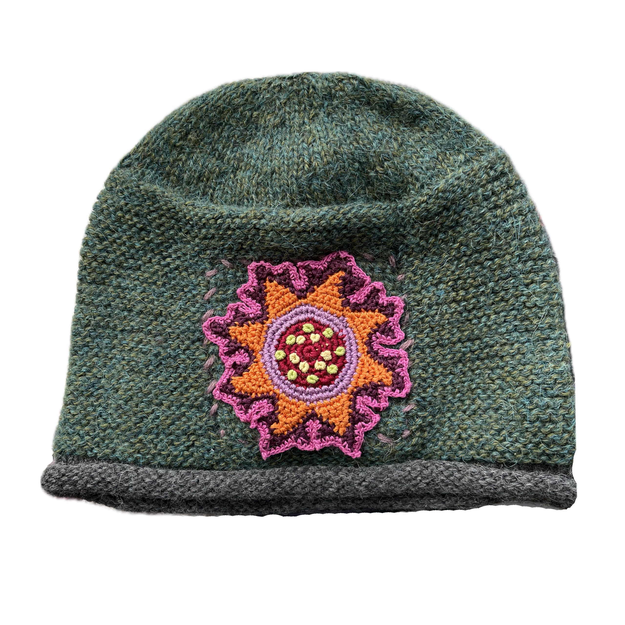 Heathered teal and gray yarns are the backdrop to a beautifully crocheted flower patch, knit from pima cotton. Fun and playful . . . Alpaca, acrylic blend hand knit in Peru. Dry clean or hand wash cold.