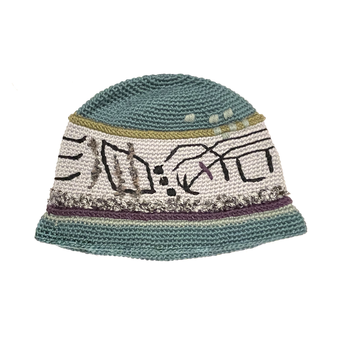 A wonderful crocheted bucket hat with emboidery inspired by japanese sumi-e brushstrokes. Where the brim folded up or down to keep your ears warm. Alpaca/acrylic blend and hand knit in Peru. Hand wash.