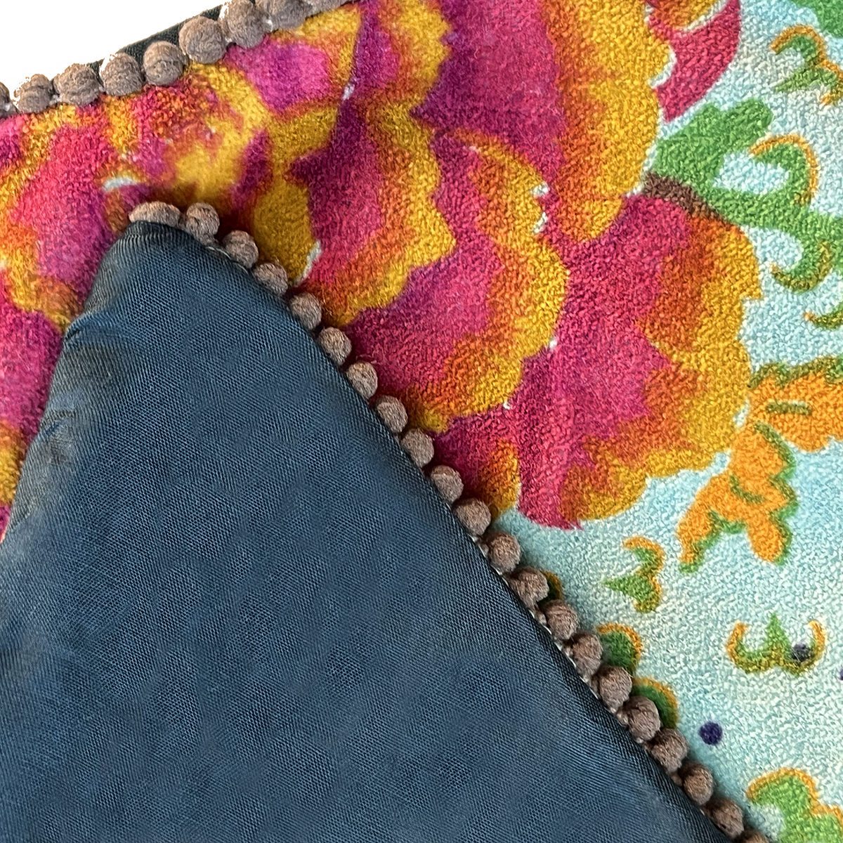 Joyful floral prints and colors embrace your neck and give you the strength to brace for the chill to come. 100% cotton velvet front and 100% viscose back. With bubble trim. 6″ x 70″