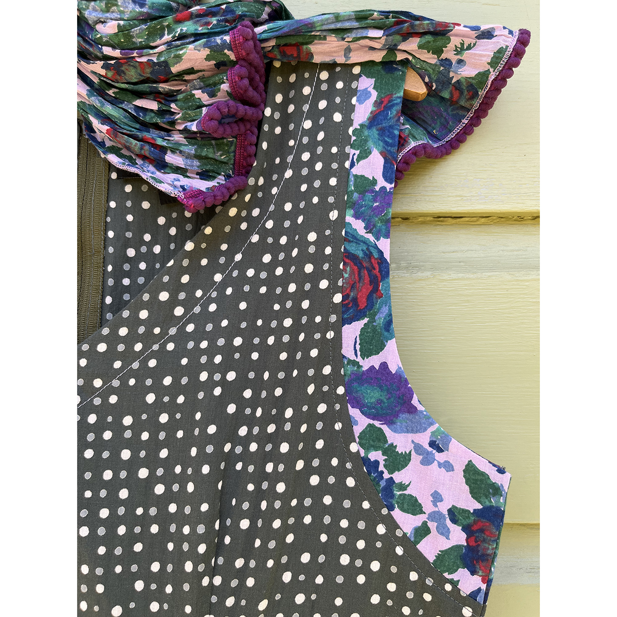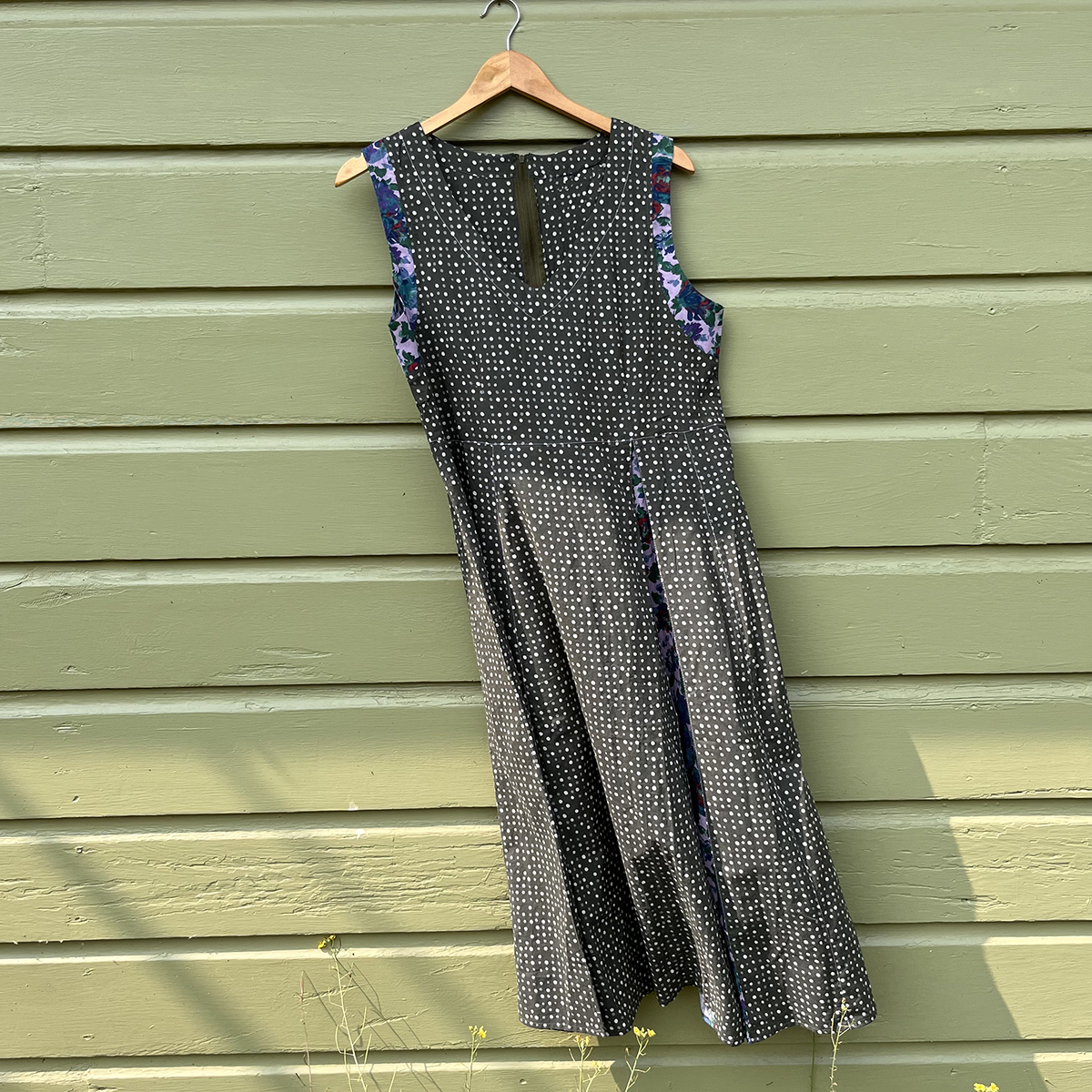 We love this elegant yet easy dress! Florals peek out through a cascade of mini dots. This goes from day to night and everything in between. Mini dots printed on army-green tinted charcoal. 100% Cotton. Zip up back. Approx 46″ length. Made in India.