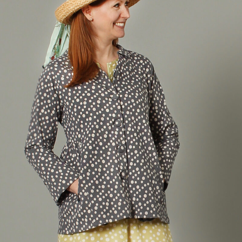 Whimsical polkadots on a charcoal background. Softly gathered at the sides and back. It’s just a great jacket for many seasons and occasions. Side pockets, of course. All trimmed in a subtle floral print of pale blue, black, and wine on placket, cuff, and pockets. Length approx 30″. 100% cotton with 3% lycra for stretch twill. Made in India.