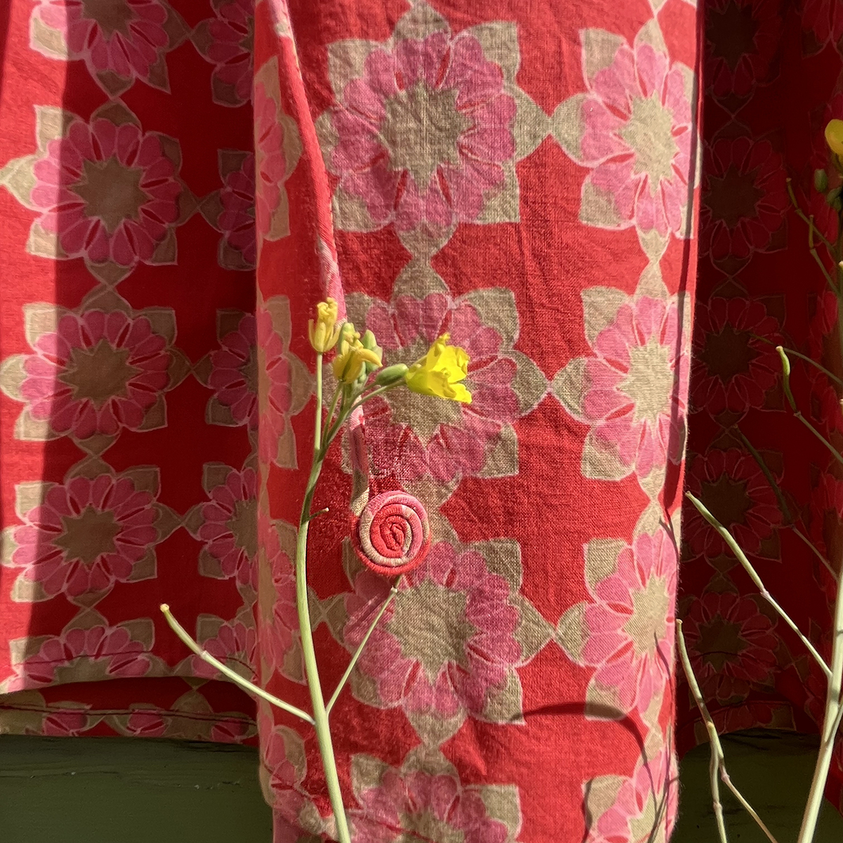 $124.00Drop shoulder long blouse/dress/duster. Appliqued flowers. Beautifully block printed in simple, bold, bright colored detail. 100% cotton. Small batch, hand block printed in India. Hand wash.