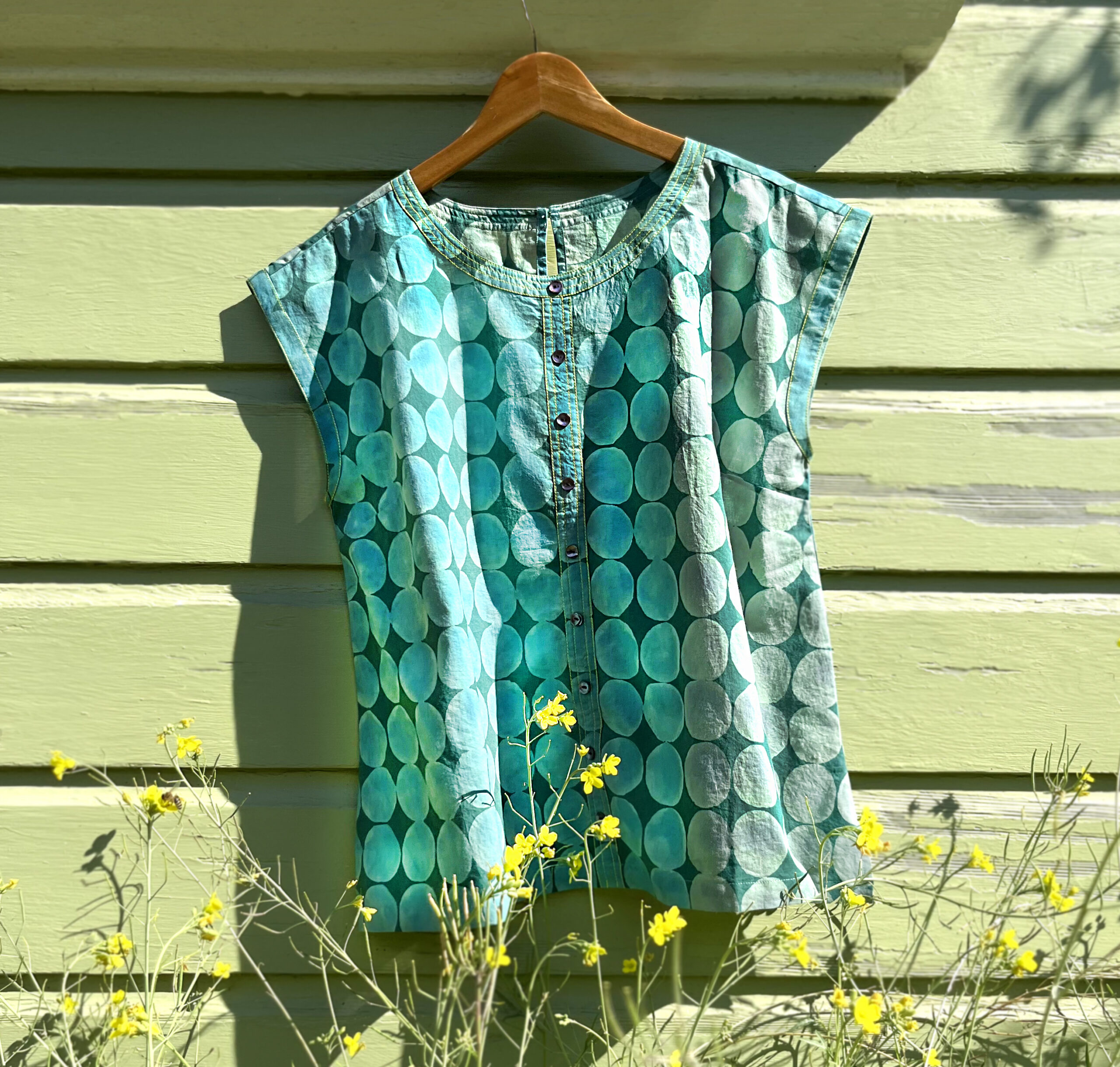 Beautiful hues combine in this easy pull over, faux-button front blouse, with key hole back. Sewing machine stitching details in green along trim. The Paulina Blouse, a vibrant and artisanal piece from our exclusive hand-block printed collection, is expertly printed on soft, breezy 100% cotton. Every thoughtful detail reflects careful craftsmanship, starting with designing the distinctive prints to the neatly finished tailoring. Lovingly handmade in India, these beautiful printed fabrics, are specially created for the Little Journeys Chicago’s exclusive block printed collection. To preserve their beauty, gently hand wash and line dry. Approx. length: 25″.